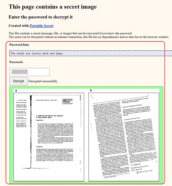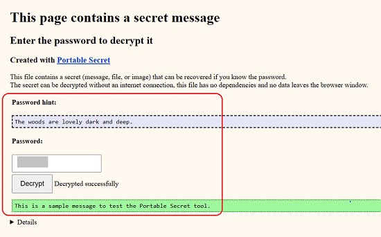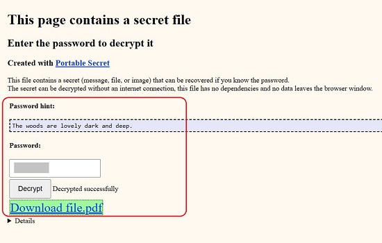 De acordo com os criadores do Portable Secret, o arquivo HTML contém uma carga útil criptografada e um código JavaScript que chama as APIs de criptografia do seu navegador da Web para o processo de descriptografia. O código usado para descriptografar os dados funciona em três etapas simples: usar a senha especificada para gerar uma chave, utilizar a chave para descriptografar a carga útil e, finalmente, exibir a mensagem ou arquivo criptografado.