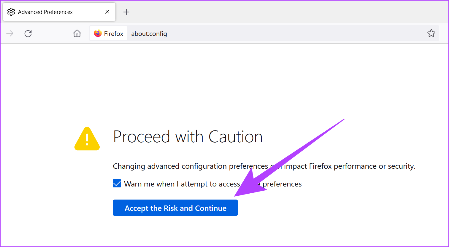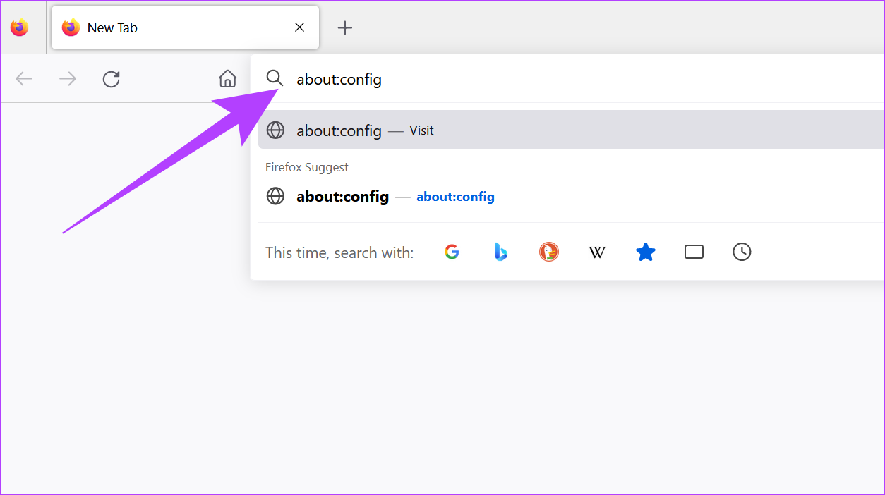 Etapa 2: Na barra de pesquisa, digite about:config e pressione enter.