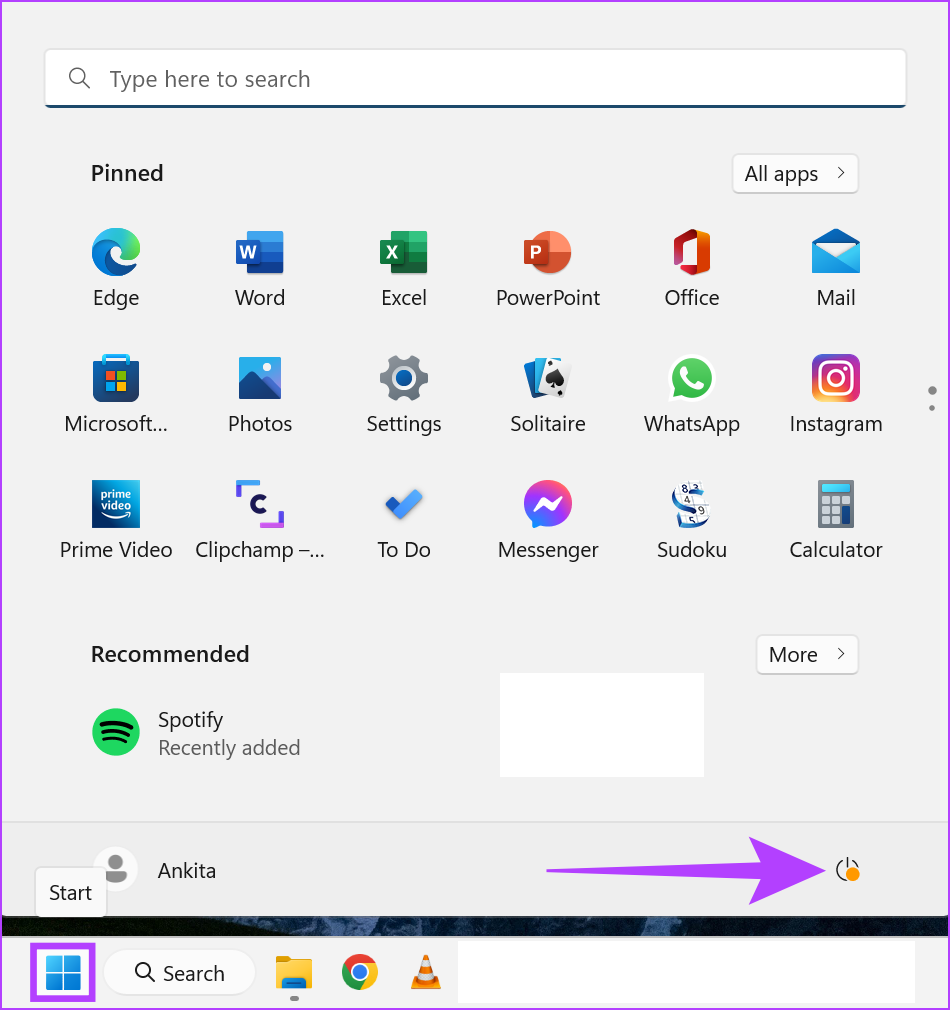 Etapa 1: Vá para Iniciar e clique em Energia.