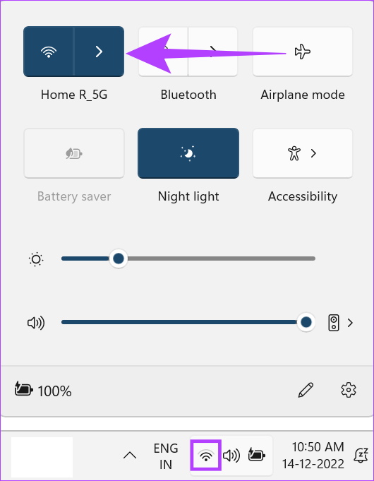 Etapa 1: Clique no ícone Wi-Fi na barra de tarefas do Windows e, em seguida, clique no botão Wi-Fi nas opções do menu.