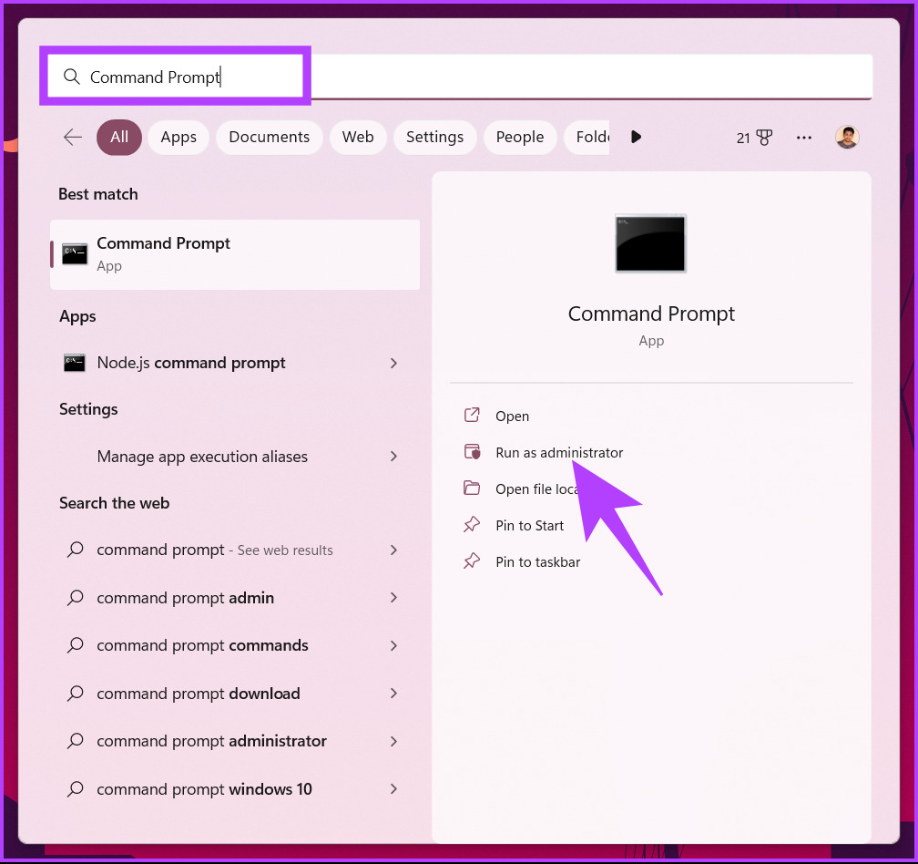 Etapa 1: pressione a tecla Windows no teclado, digite Prompt de comando e clique em’Executar como administrador’.