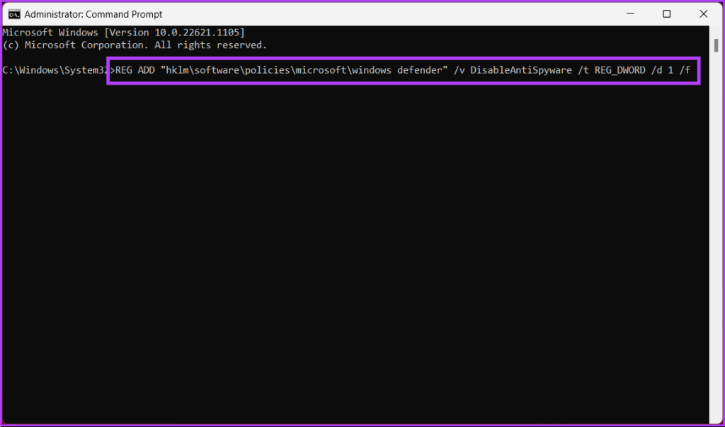 REG ADD”hklm\software\policies\microsoft\windows defender”/v DisableAntiSpyware/t REG_DWORD/d 1/f