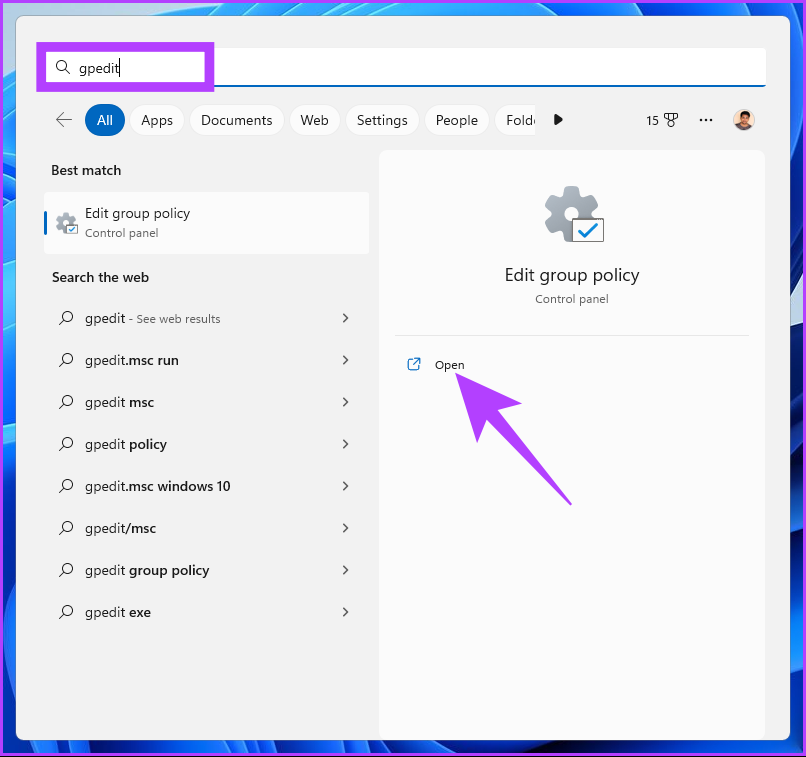 Etapa 1: pressione as teclas do Windows no teclado, digite gpedit e clique em Abrir.