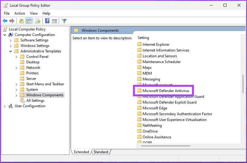 Etapa 5: Em Componentes do Windows, selecione’Microsoft Defender Antivirus.’