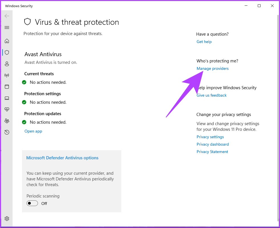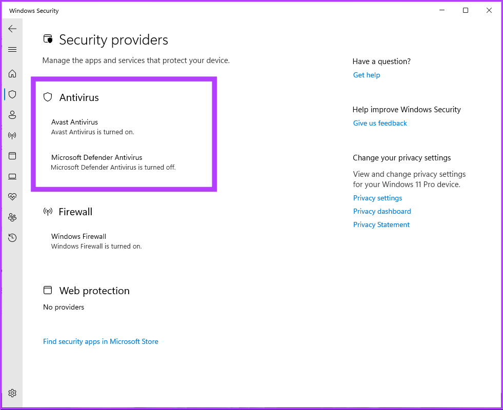 Você verá que o antivírus de terceiros está ativado nos provedores de segurança. Por outro lado, o Microsoft Defender está desativado.