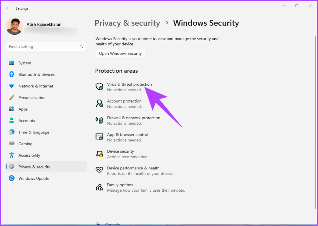 Etapa 4: em Áreas de proteção, selecione’Proteção contra vírus e ameaças.’
