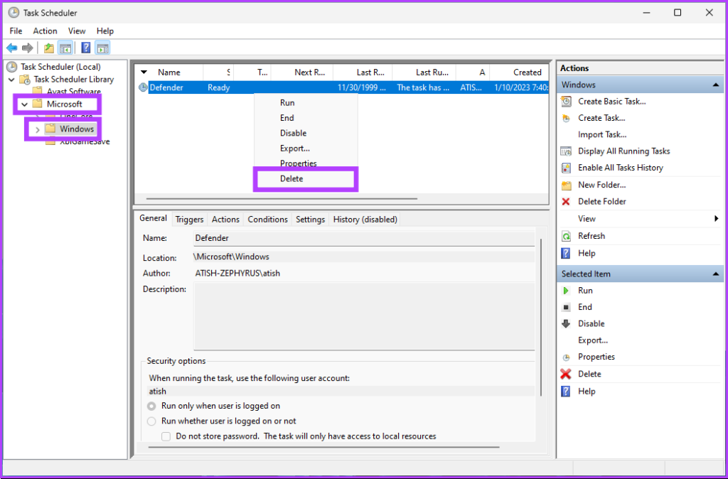 Se você vir alguma tarefa listada no painel do meio, clique com o botão direito nela e escolha Desativar. Você também pode precisar desabilitar um ou mais serviços do Windows Defender.