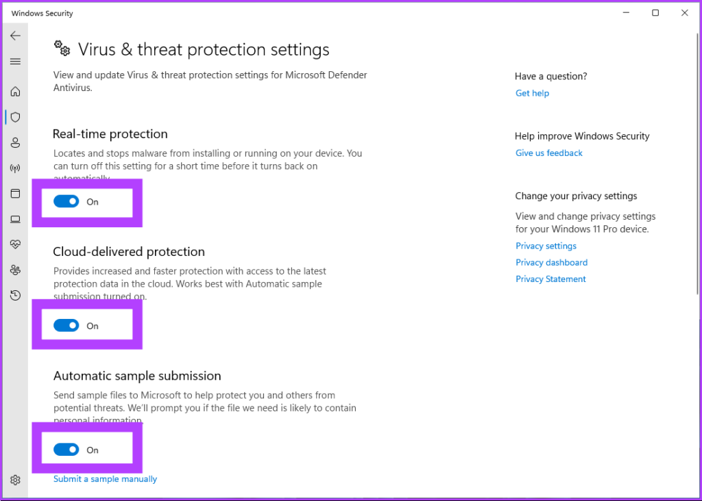 Etapa 6: Agora, habilite o Alternância’Proteção em tempo real’e outras alternâncias nesta página.