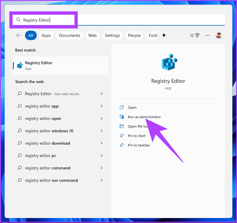Etapa 7: pressione a tecla Windows no teclado, digite Editor do Registro e clique em’Executar como administrador’.