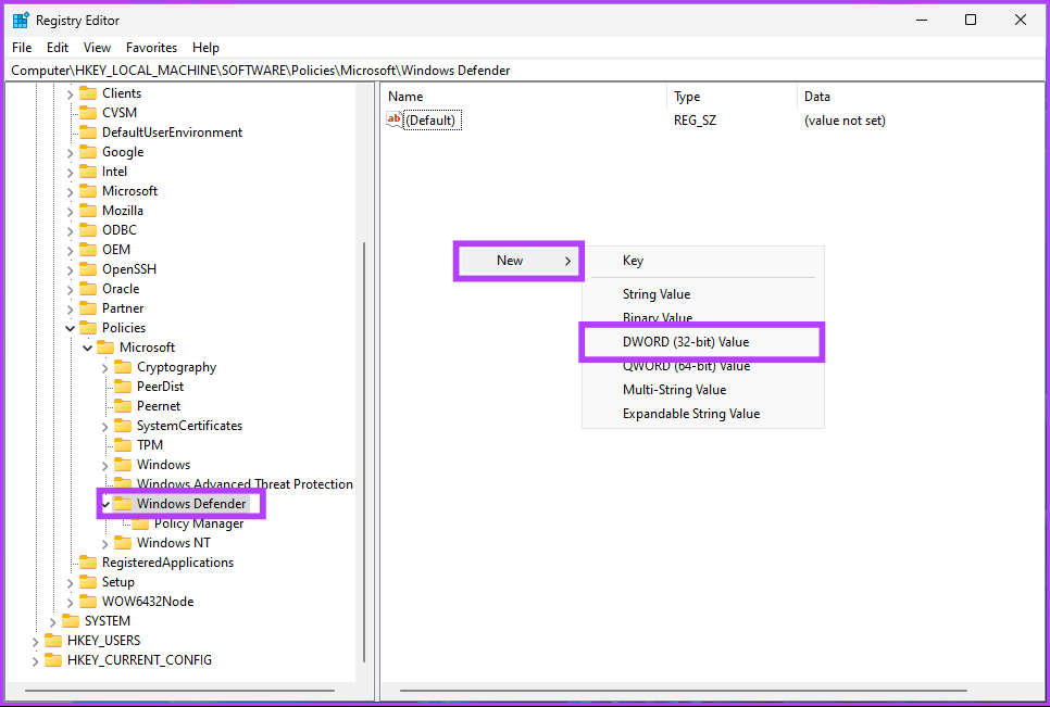 Etapa 9: na pasta Windows Defender, clique com o botão direito do mouse, selecione Novo e escolha’Valor DWORD (32 bits)’.