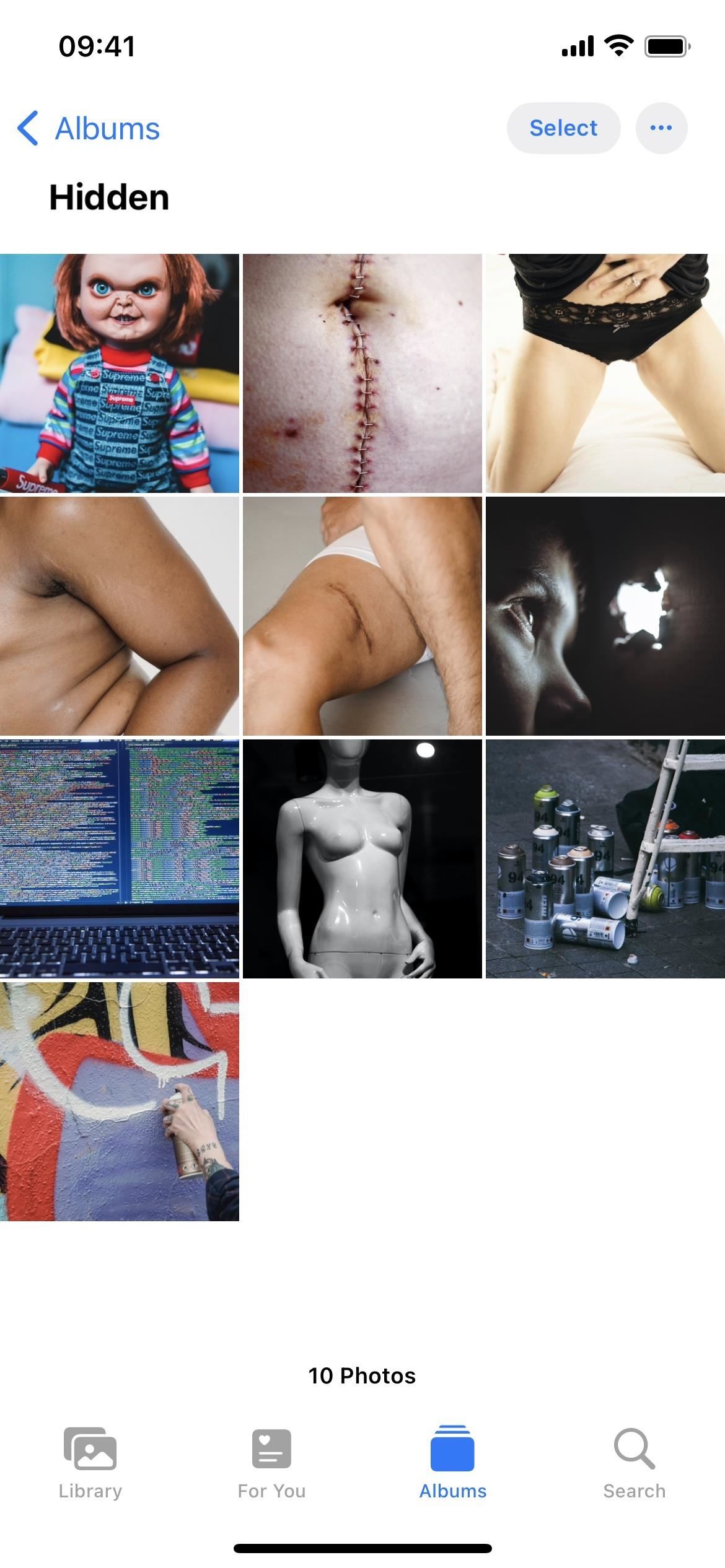 Você também pode ocultar várias fotos e vídeos ao mesmo tempo. Em uma exibição em grade na guia Biblioteca, Álbuns ou Pesquisa, escolha”Selecionar”na parte superior, escolha todo o conteúdo que deseja ocultar, toque no ícone de reticências (•••) na área inferior, escolha”Ocultar”e selecione”Ocultar [#] fotos”,”Ocultar [#] vídeos”ou”Ocultar [#] itens”nas ações exibidas.