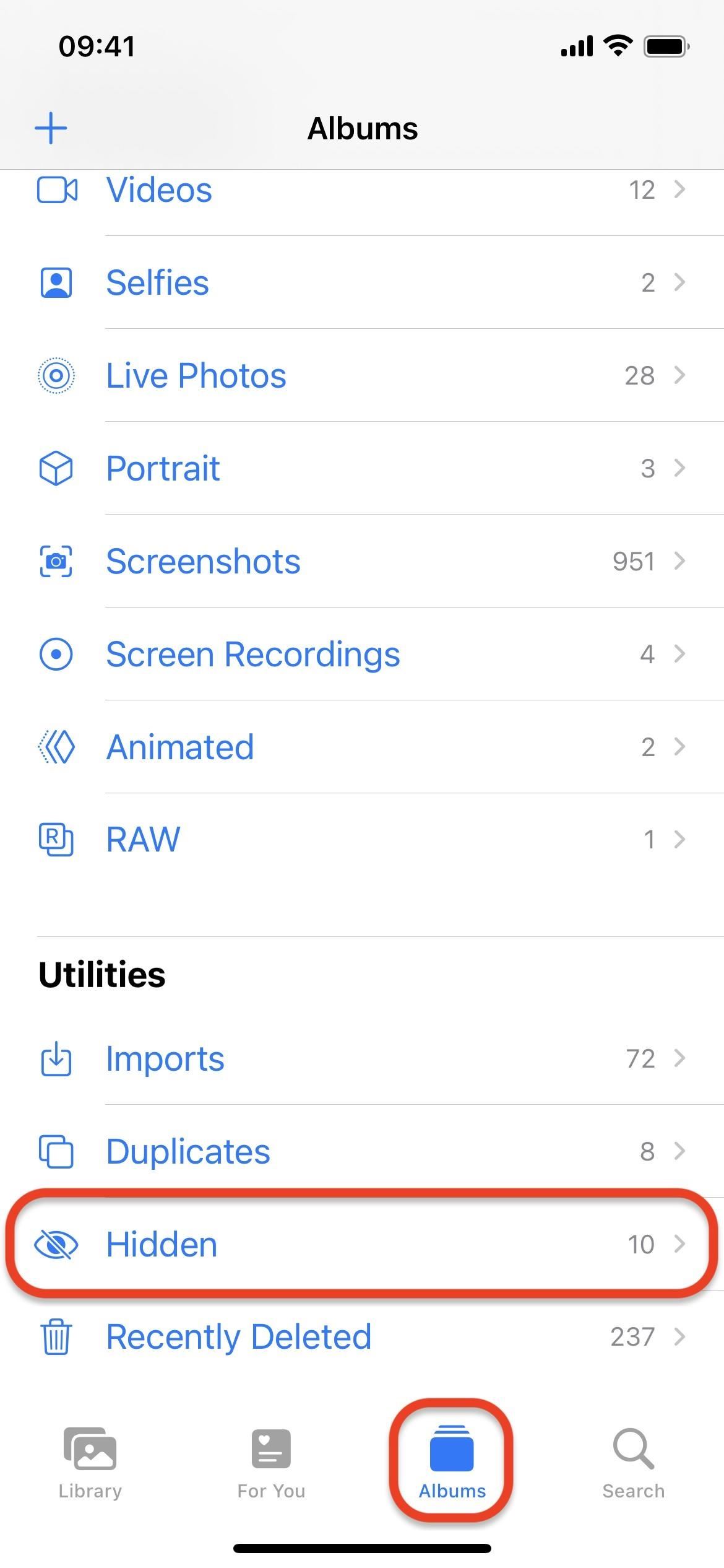 Você pode encontrar seu álbum Oculto na parte inferior da guia Álbuns quando as imagens e os vídeos estiverem ocultos. Por padrão, você poderá ver o álbum, que informará quantas fotos e/ou vídeos há na pasta.