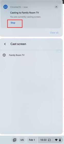 4. Para desconectar seu Chromebook da TV, clique em “Parar” no painel de Configurações rápidas.