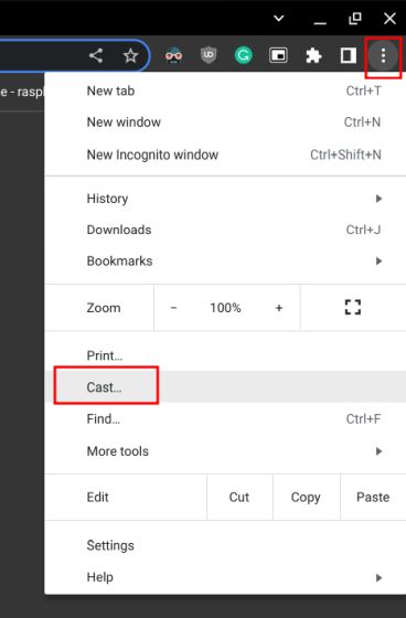 1. Abra o navegador Chrome no seu Chromebook e verifique se a TV está ligada. Além disso, verifique se os dois dispositivos estão na mesma rede Wi-Fi. Agora, clique no menu de três pontos no canto superior direito e clique em “Transmitir” no menu suspenso.