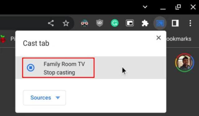 4. Para interromper a transmissão, clique no botão”Transmitir”na barra de ferramentas do navegador Chrome e escolha”Parar transmissão“.