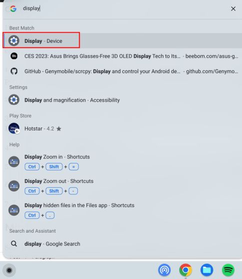 3. Volte para o seu Chromebook, abra o Iniciador de aplicativos no canto inferior esquerdo e procure por “display”. Agora, abra “Tela – Dispositivo“.