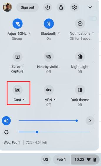1. Primeiro, abra o painel Configurações rápidas em seu Chromebook no canto inferior direito. Aqui, procure a opção “Transmitir” e abra-a. Observe que, se a opção “Transmitir” não aparecer, significa que sua Android TV não está ligada ou não está conectada à mesma rede Wi-Fi. Portanto, certifique-se de que ambas as condições sejam atendidas.
