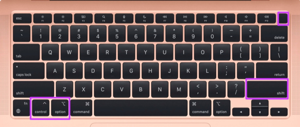 Etapa 2: Aguarde alguns segundos. Em seguida, pressione e segure o atalho de teclado Shift + Opção Esquerda + Controle esquerdo. Pressione e segure o botão liga/desliga também.