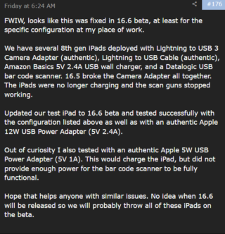 Atualizado para 16.5 hoje. Meu iPad de 7ª geração é usado para aplicativos de música midi. Eu tenho um adaptador de câmera Lightning USB da Apple com carregamento. A porta de carregamento não funcionará mais para o iPad.