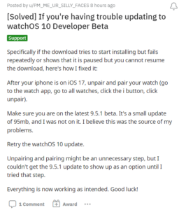 No entanto, os usuários do Apple Watch que tentam atualizar para o watchOS 10 beta não conseguem fazer isso porque encontram uma série de desafios (1,2, 3).