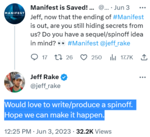 Parece que os fãs voltaram à plataforma com as mesmas esperanças. Observe que tudo começou coincidentemente com o criador e produtor do programa, Jeff Rake, expressando interesse em uma sequência ou spin-off do Manifest.