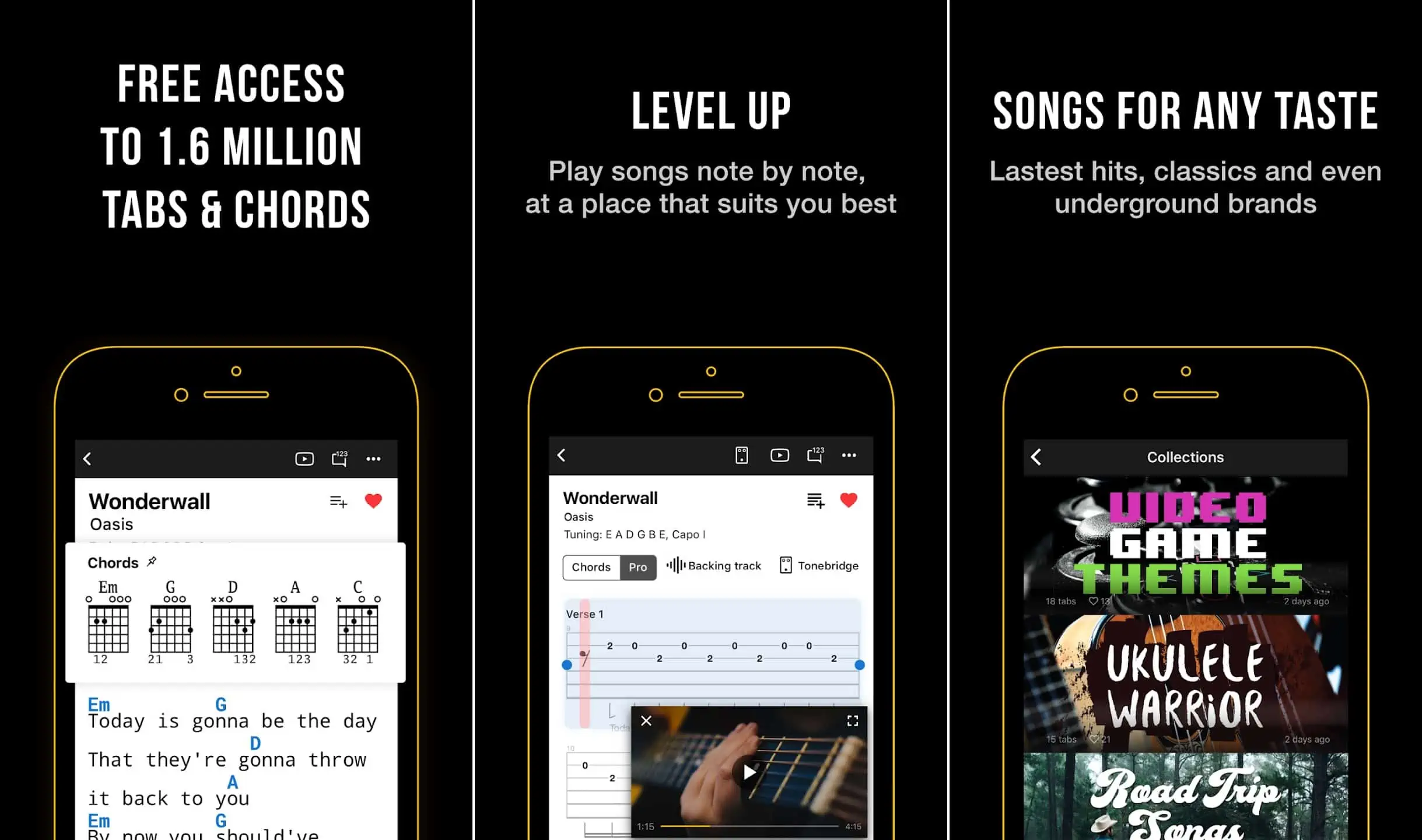 Ultimate Guitar tem o maior catálogo do mundo de acordes, tablaturas e letras de guitarra, baixo e ukulele. Você pode tocar mais de 15.000 músicas populares em seu som original com o Tonebridge Guitar Effects. Além disso, você obtém acordes, tablaturas e letras para mais de 800.000 músicas neste aplicativo. Você pode procurar qualquer música por tipo, dificuldade, afinação e classificação. Há também uma coleção de músicas para momentos específicos de guitarristas profissionais.