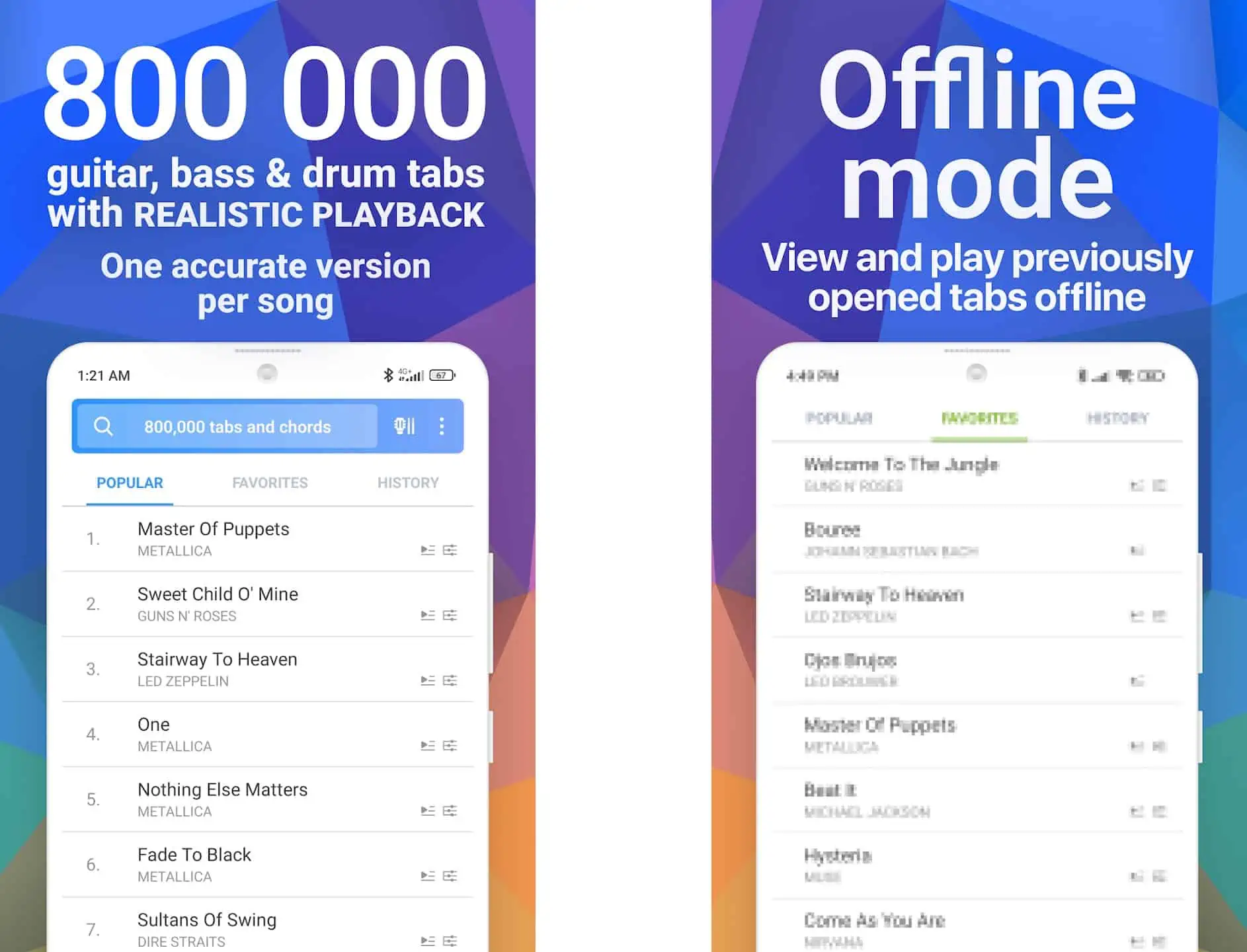 Todas as músicas neste aplicativo são de origem legal e a maioria as músicas têm tablaturas para cada instrumento individual (guitarra, baixo, bateria e vocal). O Songsterr possui um recurso de reprodução em várias velocidades para que você possa desacelerar a faixa para aprender as partes difíceis. Há também um modo solo onde você só ouvirá o instrumento que está tocando, ou seja, a guitarra. Silenciar faixa atual, modo Loop, modo offline, Contagem, Histórico e Favoritos são alguns outros recursos notáveis deste aplicativo.