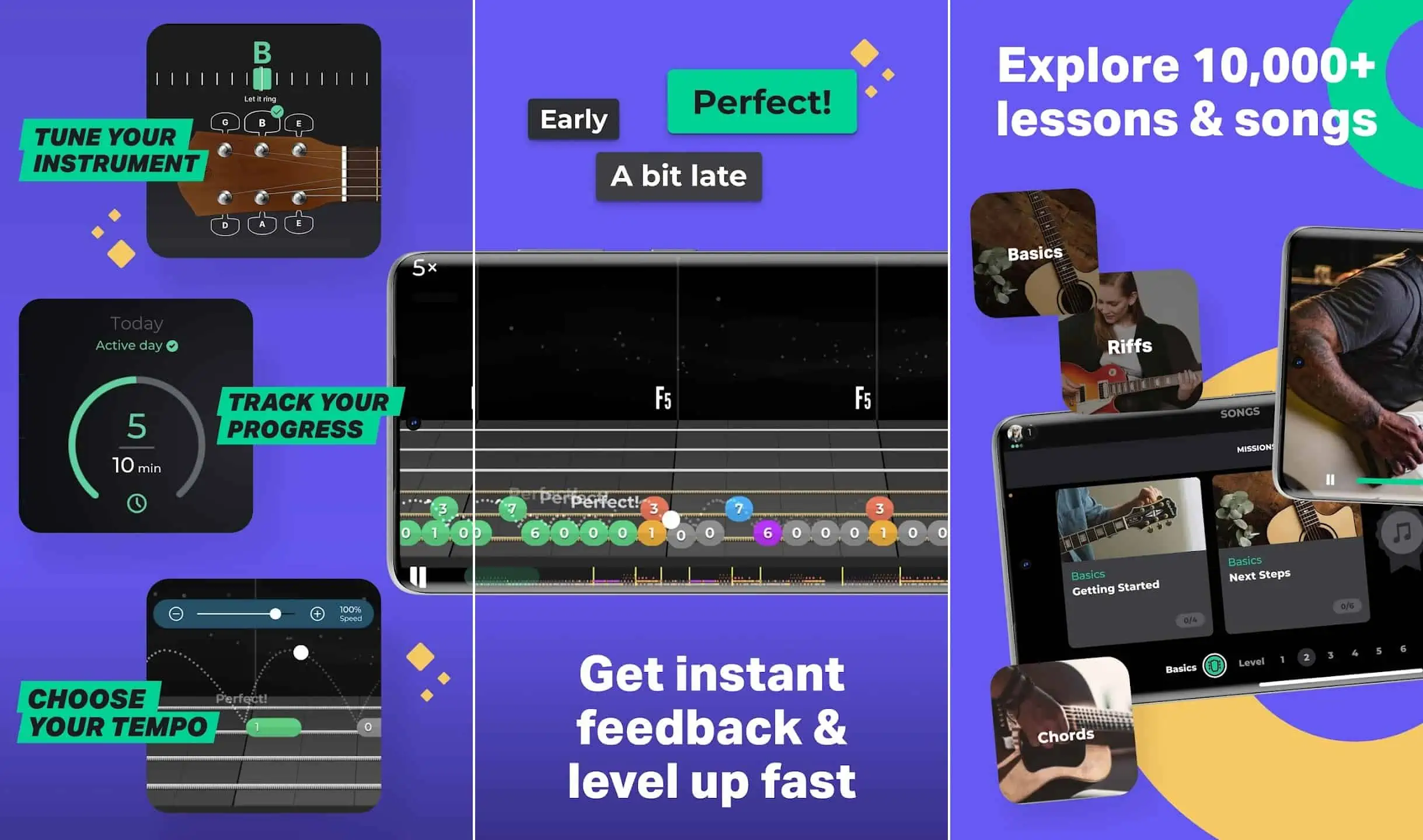 O aplicativo é fácil de navegar e usar. O download é gratuito e oferece compras no aplicativo para vários planos de assinatura que desbloqueiam tempo de jogo ilimitado e ininterrupto em todas as plataformas. Além do violão, Yousician também oferece tutoriais em vídeo e guias passo a passo sobre piano e ukelele.