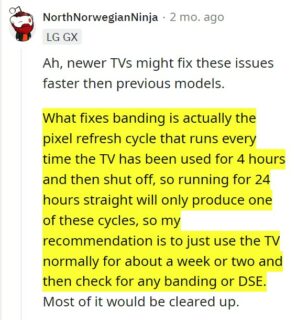 Felizmente, encontramos uma possível solução alternativa que pode ajudar a resolver seu problema. É recomendado que você usa a função de atualização de pixel ou atualização de painel em sua TV OLED para se livrar desse problema.