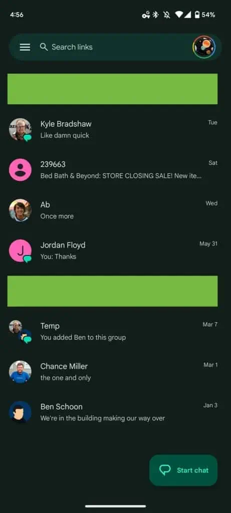 De qualquer forma, Mensagens do Google nunca se esforçou para destacar o RCS chats. No momento, você não pode realmente dizer a diferença olhando para sua lista de bate-papo, de jeito nenhum. Você só saberá quando abrir o chat ou começar a escrever uma mensagem para alguém.
