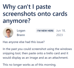 No entanto, relatórios recentes indicam que os usuários do Trello estão enfrentando problemas em que não conseguem copiar e colar imagens diretamente nos cartões, tornando a função da área de transferência ineficaz (1,2,3).