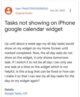 I’Estou lidando com o mesmo problema também. Minhas tarefas do Google Agenda não estão aparecendo no widget do meu iPhone. Isso pode ser consertado o mais rápido possível? Obrigado! (Fonte)