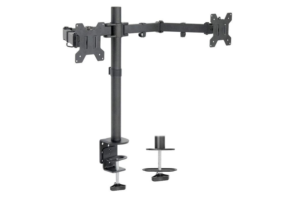 O suporte de mesa para dois monitores da VIVO acomoda telas de 13 a 30 polegadas. Ele pode suportar até 22 libras de peso, o que deve ser suficiente para a maioria dos modelos de monitor. Ele suporta inclinação de 90°, giro de 180° e rotação de 360°, para que você possa mover o monitor e visualizar a tela em um ângulo específico facilmente.