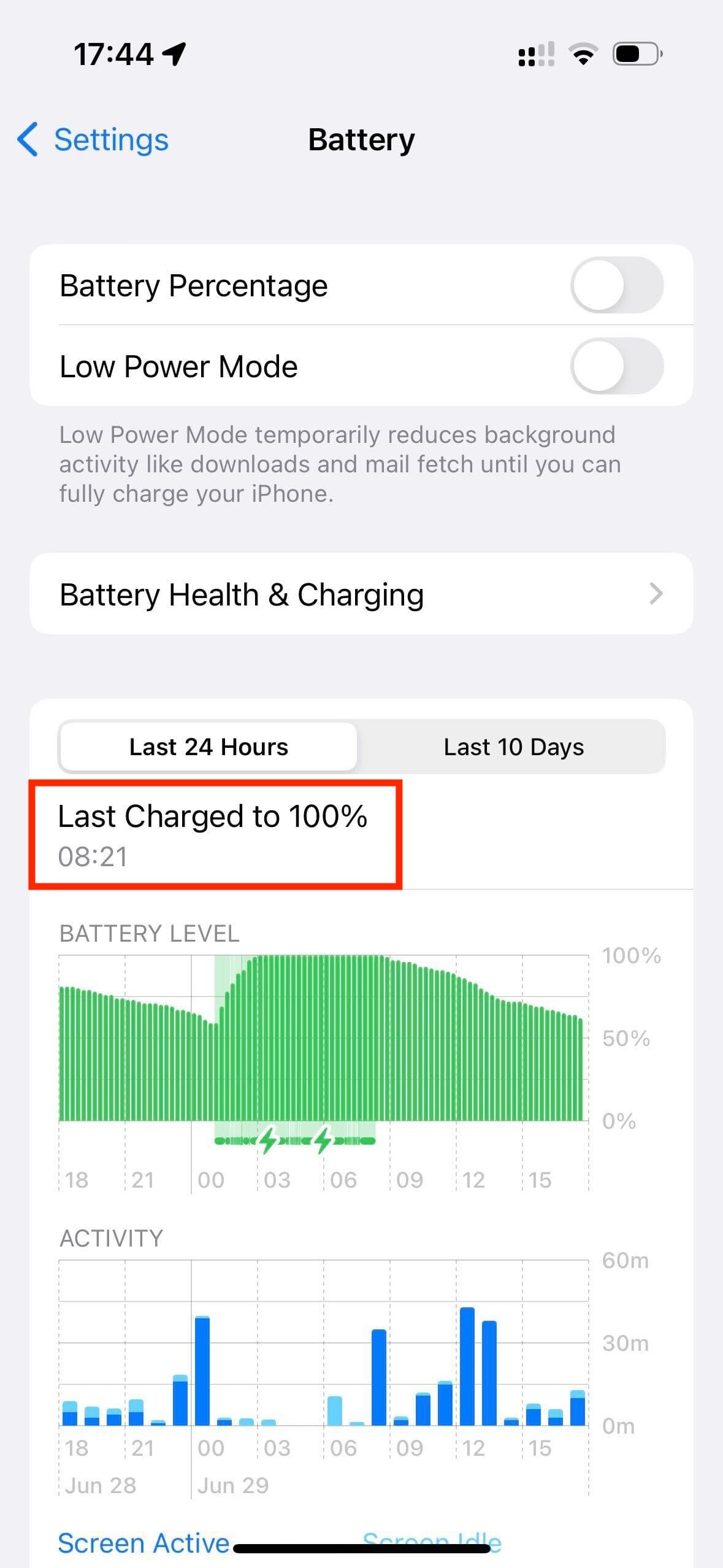 Dica: você pode ver quando seu iPhone foi carregado pela última vez e em qual porcentagem acessando o aplicativo Configurações > Bateria.