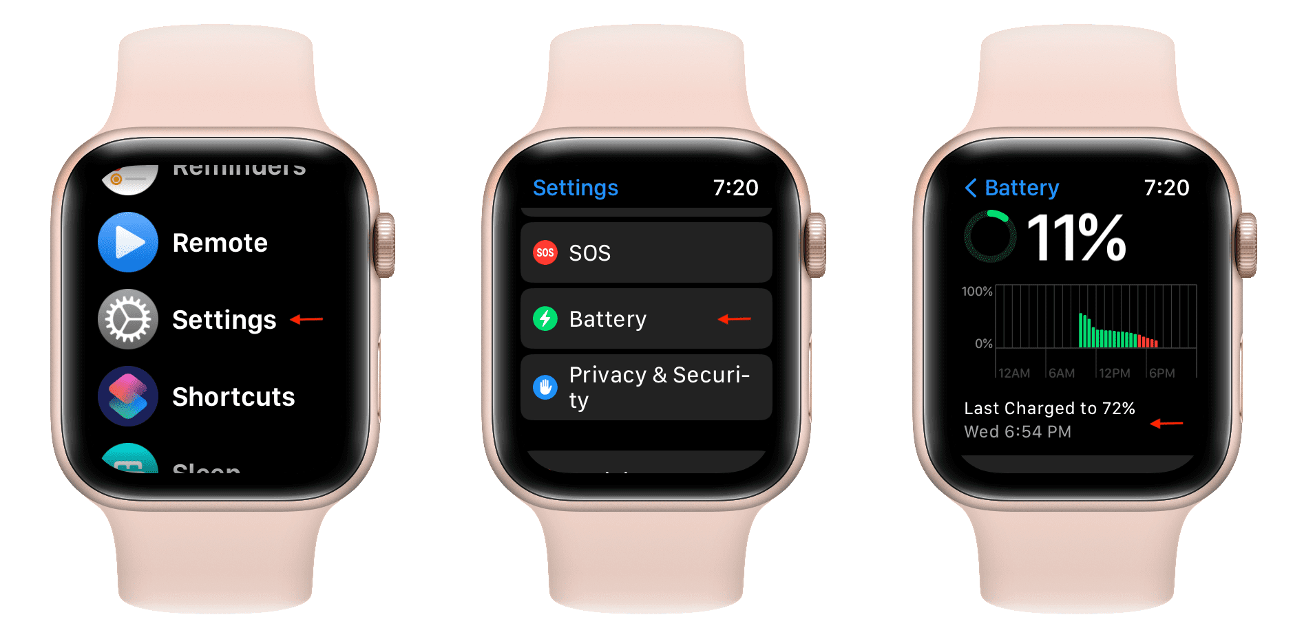 Abra as Configurações no seu Apple Watch. Role para baixo e toque em Bateria. Aqui, você verá a porcentagem de bateria com a qual seu relógio foi carregado pela última vez. E abaixo disso, você verá o dia e a hora em que o relógio foi carregado pela última vez. Além das informações baseadas em texto, você também tem um pequeno gráfico na parte superior, fornecendo os detalhes do histórico recente de carga da bateria do seu relógio.