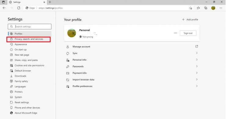 Clique em Privacidade, pesquisa e serviços no painel esquerdo.