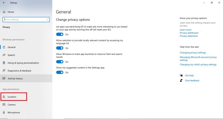 Etapa 3: no painel esquerdo, existem várias opções. Selecione Local em Permissões do aplicativo.