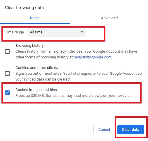 Abra o Google Chrome . Agora pressione as teclas Ctrl + Shift + Delete em seu teclado. Selecione Todo o tempo no menu suspenso Intervalo de tempo e marque a caixa Imagens e arquivos em cache . Selecione Limpar dados .