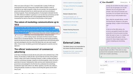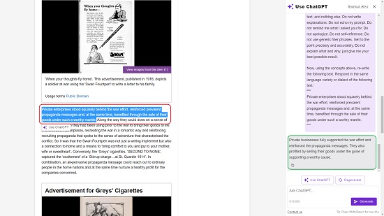 6。任何時候您想直接使用 ChatGPT 聊天,您都可以在側邊欄中輸入文本提示,然後單擊“生成”以獲得響應。