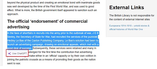 3.導航到網頁並選擇其中的任何文本。接下來,單擊“使用 ChatGPT 按鈕並選擇總結、翻譯、解釋等”。