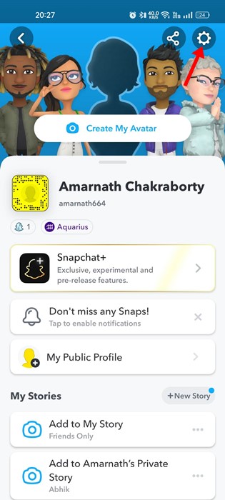 3.這將打開個人資料頁面。在此屏幕上,點擊右上角的設置齒輪圖標。