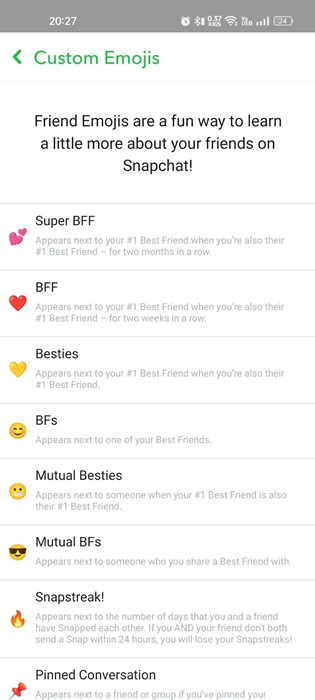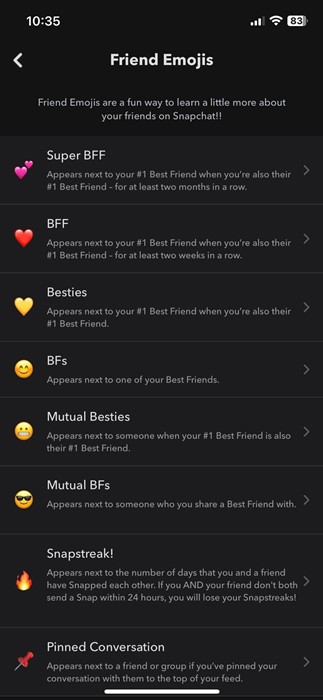 當您收到或發送來自朋友的快照時,Snapchat 應用程序會自動在聊天列表旁邊應用一個朋友表情符號。根據 Snapchat 的說法,應用程序上的朋友表情符號旨在幫助您跟踪朋友。
