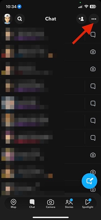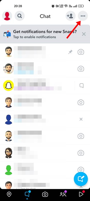 2.當 Snapchat 應用程序打開時,點擊底部的聊天圖標。在下一個屏幕上,點擊右上角的三個點。