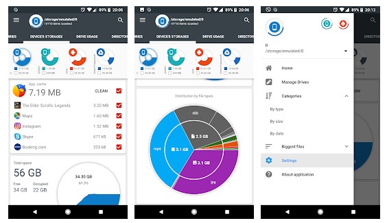 該應用程序以簡單的圖形形式顯示 SDCard、USB 設備、外部和內部存儲以及雲存儲信息。除此之外,它還有一個緩存清理器,可以快速刪除應用程序的緩存文件。