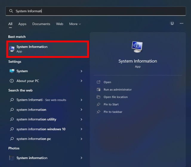 1.首先,按 Windows 鍵或單擊任務欄中的搜索按鈕。然後,在搜索框中輸入“系統信息”,然後點擊結果。