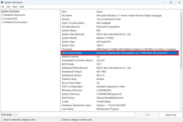 2。系統信息窗口打開後,單擊左側邊欄中的“系統摘要”。然後,查找 BIOS 版本/日期部分。您的 BIOS 製造商的名稱將寫在此處。您還可以訪問 Windows 11 上的 BIOS 或 UEFI 以檢查製造商的名稱。
