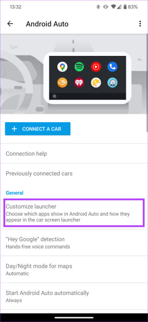 第 3 步:您現在將進入 Android Auto 設置。點擊常規設置下的自定義啟動器。