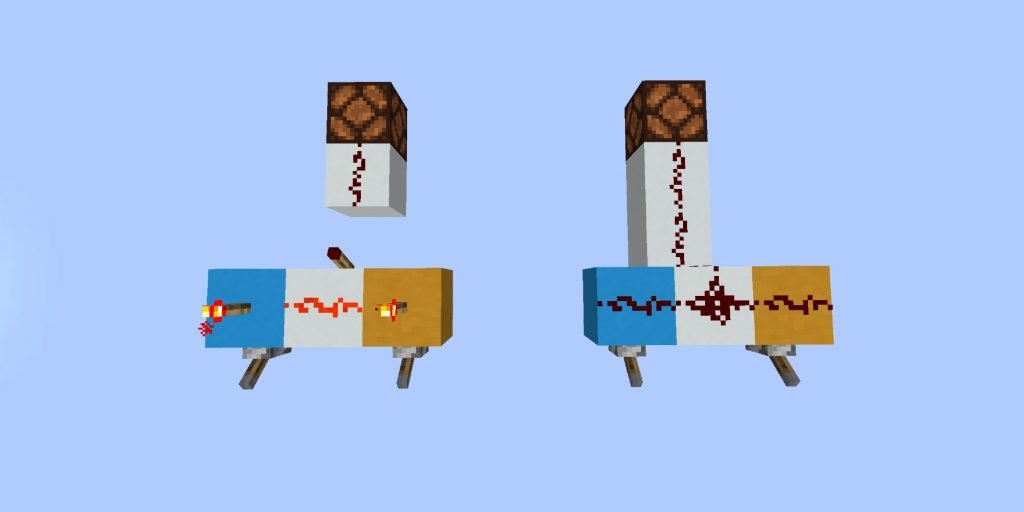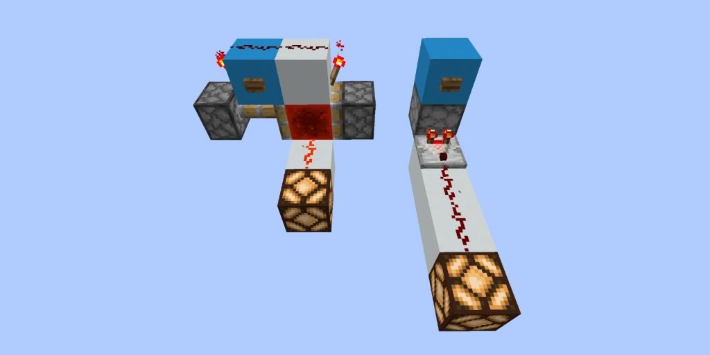 上圖是最常見的兩種邏輯遊戲中的大門。左邊是標準輸入/輸出門,意思是當輸入被觸發時,它會向輸出發送一個信號,並且會發生一些事情(在這種情況下,燈會亮起)。圖中右邊的門是一個非門,也稱為逆變器,這是紅石火把的主要用途。默認情況下,紅石火把處於活動狀態並輸出信號,但對其供電會使其關閉。這意味著在此示例中,默認情況下燈是打開的,但輕彈開關會關閉它。