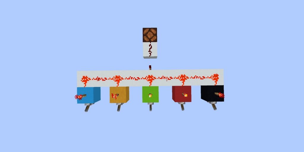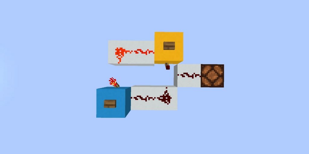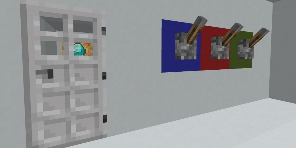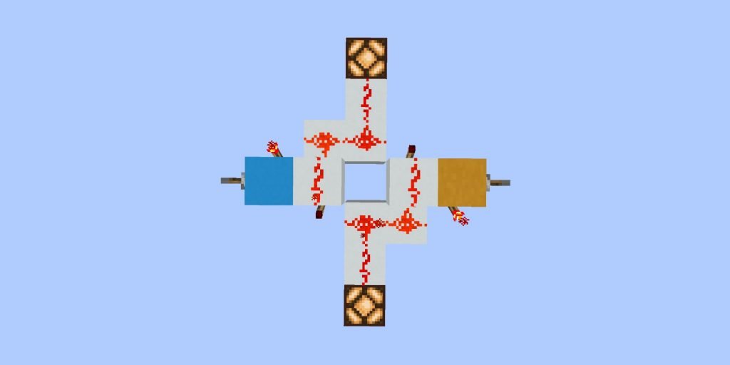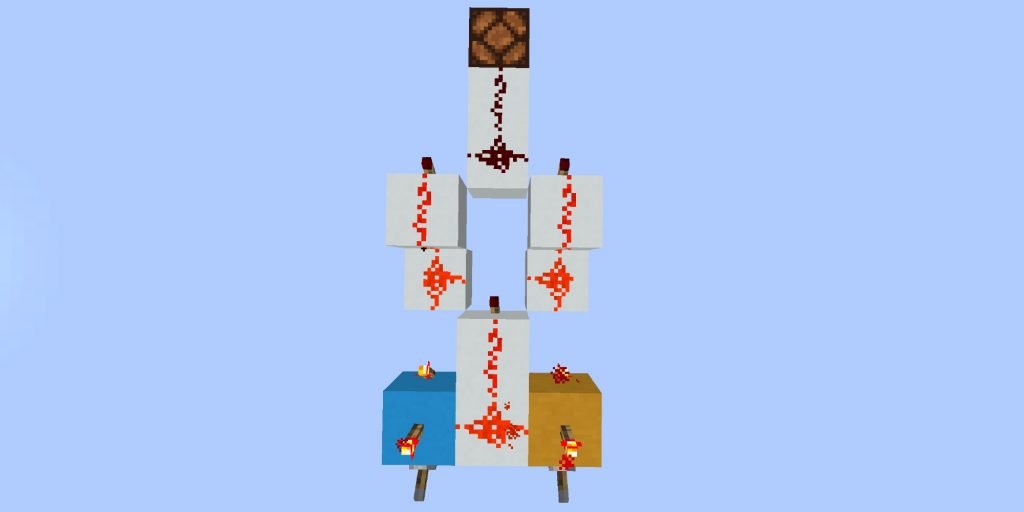 這裡的邏輯相當簡單。當拉動槓桿時,遠離它的第二個紅石手電筒會通電,從而使另一個電路保持供電,無論其槓桿的狀態如何。這意味著,如果拉動一個槓桿,則必須先將其彈回,然後才能使用另一個槓桿,反之亦然。