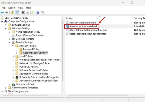 3.現在,選擇左側的帳戶鎖定策略。在右側,雙擊帳戶鎖定閾值。